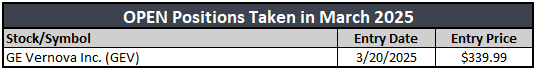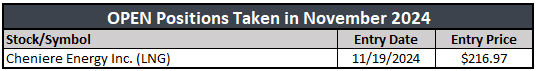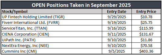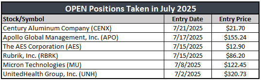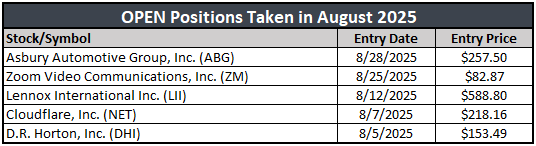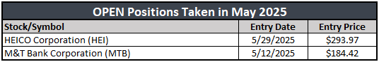 The open positions displayed on this page represent alerts from Charles’ primary alert service that have not had an alert to close the position. These are for stock positions only, not options. Open positions are attributed to the month when the alert was sent. These positions are not current recommendations for investments for individuals as the entry opportunity may have passed based on Charles’ criteria. All investments may not suitable for you, your particular investment objectives, financial situation or needs. All final investment decisions are yours and individual performance will vary.